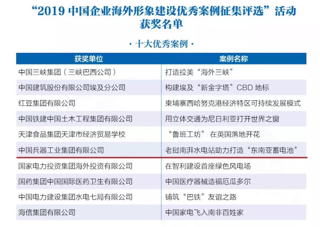 12月3日,由國務院新聞辦公室、國務院國資委、全國工商聯指導,中國外文局主辦,中國報道雜志社承辦的“2019·中國企業海外形象高峰論壇”在北京舉行,由中國報道雜志社和國務院國資委新聞中心聯合開展的“2019中國企業海外形象建設優秀案例征集活動”評選結果揭曉,中國兵器工業集團北方公司老撾南湃水電站項目榮獲2019中國企業海外形象建設十大優秀案例及卓越社會責任獎。
