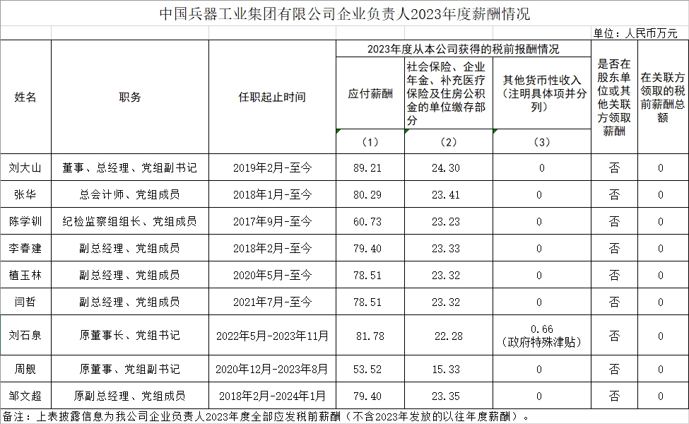 中國兵器工業集團有限公司企業負責人2023年度薪酬情況