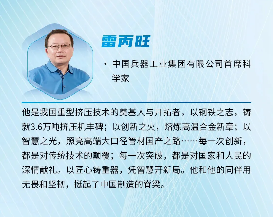 雷丙旺是我國極端金屬擠壓技術的開拓者,扎根邊疆地區國防特大型企業工作38年,長期從事金屬成形制造裝備與工藝研究工作。他研制出我國極限制造的大國重器——3.6萬噸黑色金屬垂直擠壓機,一舉打破國外技術封鎖,填補國內空白,實現了超(超)臨界電站核心管道和航空發動機高壓渦輪盤粉末合金棒材的中國制造,開發出成套關鍵技術,取得一系列原創性成果,促進了產業的融合發展,創造巨大經濟社會效益。